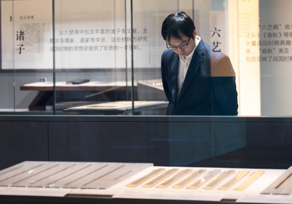10月28日,参观者在《简读中国——中国出土简牍展》上观看展出文物。新华社记者 肖艺九 摄