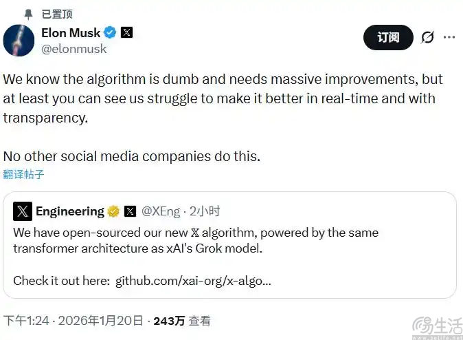 对此马斯克表示,“我们知道我们的算法很笨拙,需要大幅改进,但用户至少可以实时且透明地看到改进的努力。没有其他社交媒体公司这样做”。